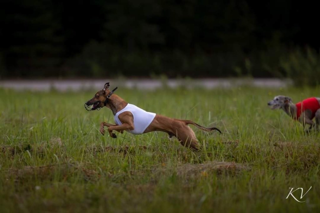 Ja samaan aikaan toisaalla Kaspian starttaili ensimmäistä maastokilpailuaan Äänekoskella kasvattajan matkassa. Aluksi oli näyttänyt hyvältä, Kaspian seurasi hyvin viehettä kunnes hieman ennen maalia oli hävittänyt sen ja päättänyt mennä tuomarin viereen istuskelemaan perusasentoon. On se hyvä että ollaan sitä rallitokoa käyty treenaamassa :D. Alla vielä Kari Vierin ottama kuva Kaspianista kisoissa.