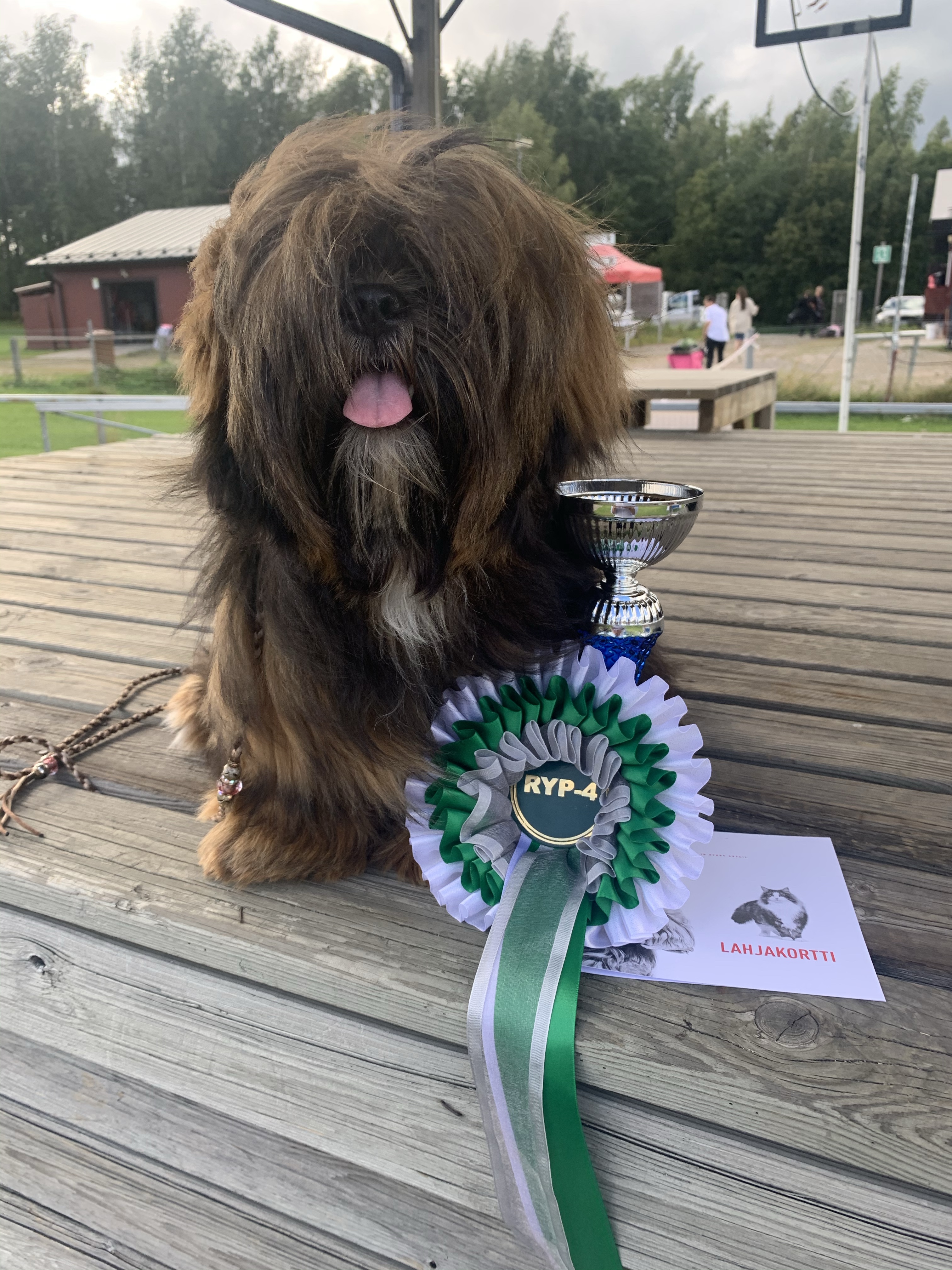 Sunnuntaina oli vuorossa Pihlan toinen näyttely. Ja millä tuloksella! Ensin Pihla valittiin rotukehässä kolmen apson joukosta rotunsa parhaaksi todella kauniilla arvostelulla. Koska näyttely oli niin lähellä ja ryhmäkehien alkamiseen vielä niin pitkä aika lähdimme välissä käymään kotona moikkaamassa muita koiria ja hakemaan ne unohtuneet herkut. Yllättävän hyvin Pihla esiintyi ilmankin, itseasiassa esiintyminen meni paremmin kuin viime viikonloppuna.